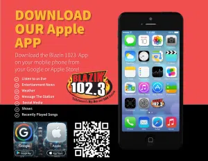 Download the Blazin 102.3 Apple App to your mobile phone from your Google or Apple App Store!! Listen live at work & on the go!